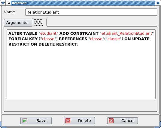 The combo under the three lists are used by PostgreSQL, and determine the type of relation between the two tables, and the definition of this type of relation conditions graphical representation of a line linking within the diagram, in order to facilitate the identifying and understanding the type of relation.