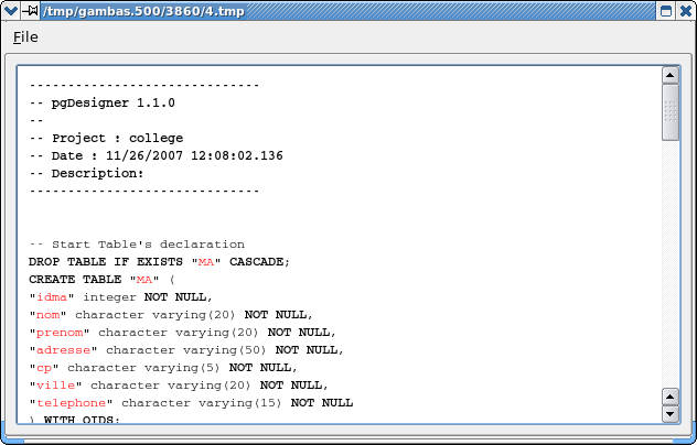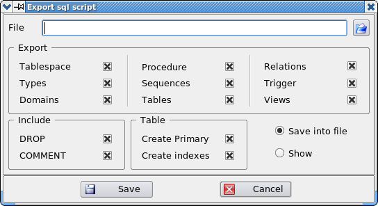You can export a project, or SQL related objects contained therein. In Group Project of the Main Menu is its voice. This opens a dialog box that, similarly to upload feature from the database, which allows you to set export items and some additional features, as shown in the figure below, the window shows a top field in which you can type the name file (including path) on which you write the SQL commands. Optionally, by the icon located on the right side of the field, you can go right on the disk directory in which to save the file itself.